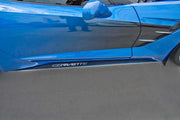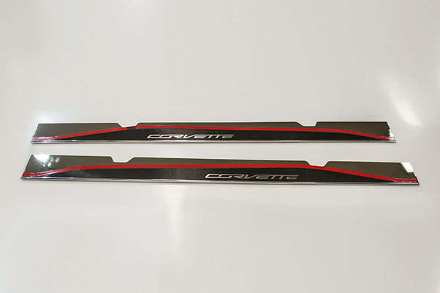 Side Skirts - C7 Corvette. Add to the low profile look of your C7 Corvette Stingray with these Officially License GM Logo Side Skirts. Manufactured with 22 Heavy Gauge Stainless Steel and Finished with a Carbon Fiber Overlay with Licensed Corvette Script. Attaches directly to your cars OEM Mounting Parts. Absolutely no drilling need for installation. 052048