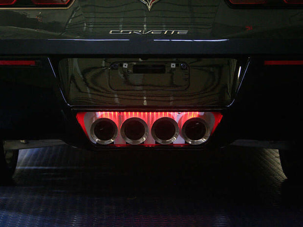 Exhaust Plate - Brushed Illuminated - C7 Corvette - Standard Exhaust. Manufactured from High Strength 304 Stainless Steel this Exhaust Filler Panel will add style to your C7 Corvette and Z06. Laser Cut for an exact fit and then finished with Red LED's and a Brushed Finish, this exhaust plate is Corvettes equipped with factory installed Standard Exhaust. 052016